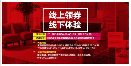2015年的春节刚过,春天duang的一下就来了。迅速回暖的气温,让家装市场的大门duang duang大开。天猫也顺势强劲推出春节装修节,聚集各大顶尖家装品牌于3月9-17日间举办盛大促销活动。阳光照明作为参加本届天猫装修节的领先照明品牌,其天猫旗舰店全力备战,不仅仅在产品上加大了优惠力度,聚惠2折起,服务不断升级回馈消费者。