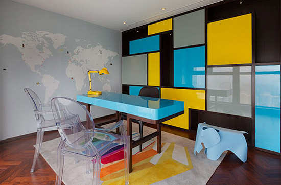 装饰点评:粉蓝和黄色的搭配非常醒目,让空间永不沉闷,不规则的搭配看上去非常具有未来感。