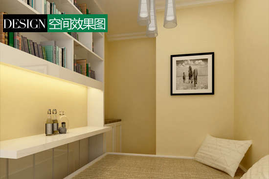 设计解读:这间儿童房色调与家居整体风格不同,墙面是明快的暖黄色,白色的简约型吊灯与白色的柜体相呼应。设计师将浅色调运用到狭小的房间中,避免局促和压抑的观感。