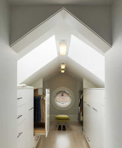 小编的话:屋顶是畸形的小空间,被很好的打造成了独立式衣帽间,独特的折叠型设计,不同于普通衣帽间,衣物都折叠在衣架上,这样的设计虽然不能顾忌到衣物的平整度与整洁度,但优点就在于,他随时可以变身为其他收纳空间,比如干货以及其他杂物。