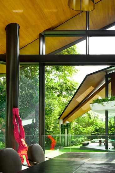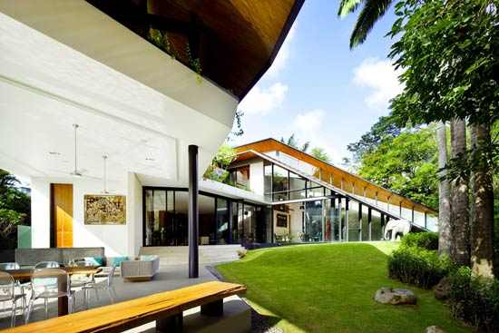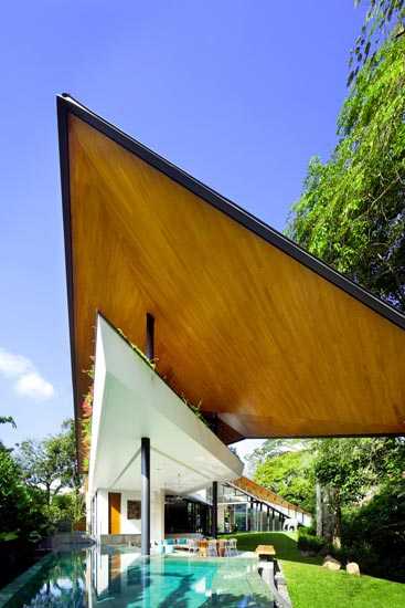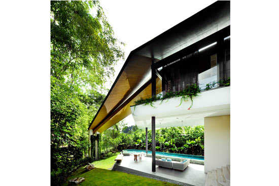 小编点评:由于房子位于热带气候区,气温较高且降雨充足,因此设计师K2LD在屋顶的设计上沿用了马来西亚的传统风格——米南加保的几何形燕尾状屋顶,有效过滤阳光的同时营造了磅礴大气的视觉效果。郁郁葱葱的绿化环境更为开放式的泳池和走廊设计提供了自然的通风效果,给人一种心旷神怡的感觉。