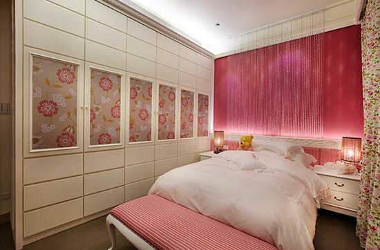 编辑点评:小孩房以浪漫的公主风格铺陈,床头是壁纸加上珠帘的设计,柜体柜门上贴附壁纸的感觉,与使用的窗帘相呼应。