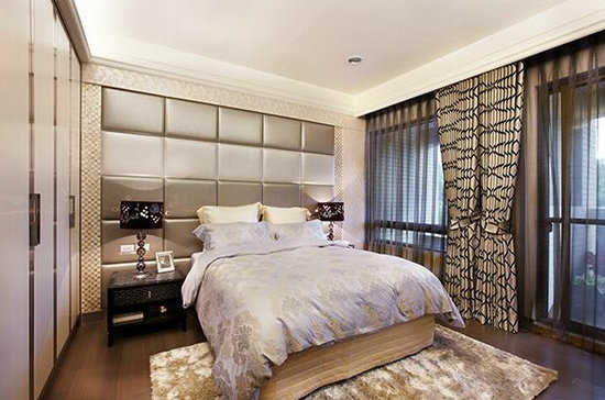 编辑点评:主卧床头以贝壳板勾勒出床头的线条,两种颜色皮革做搭配,皮革上的纹路与窗帘图腾相呼应,再以木皮混搭出温馨氛围。