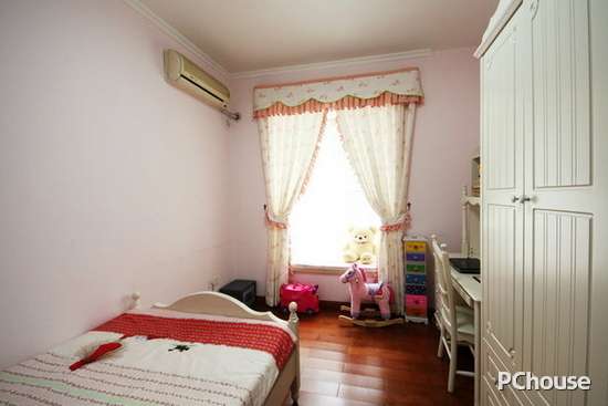 儿童房的粉色略有节制,没有满目的墙纸,白色的衣柜和电脑桌与主卧的深木色家具形成对比。