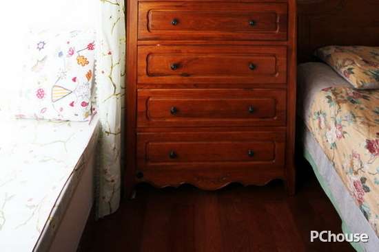 床头柜的选择极好平衡了屋内的浓重色彩,英式田园除了碎花之外,多以奶白色等白色为主。
