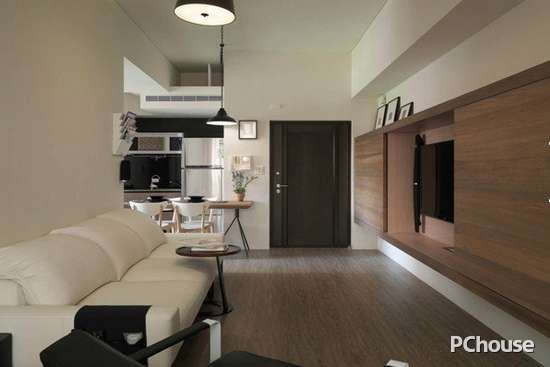 從大门旁,鞋柜柜体一体延展至窗边,並結合电视墙与书柜,简洁俐落的线条构成,既延展视觉尺度,也引导出流畅的生活动线。