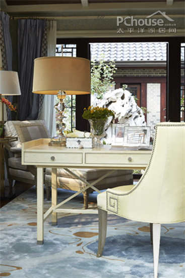 编辑点评:女主人的书房设在院中最安静的一处,散发着淡雅的气息。设计师主要运用蓝色与米色来打造这一空间,冰蓝的丝质窗帘呼应淡蓝的抽象地毯,清风吹来,白色的纱帘拂过象牙白的书桌,一切都是淡淡的,轻轻的,任时光流转。