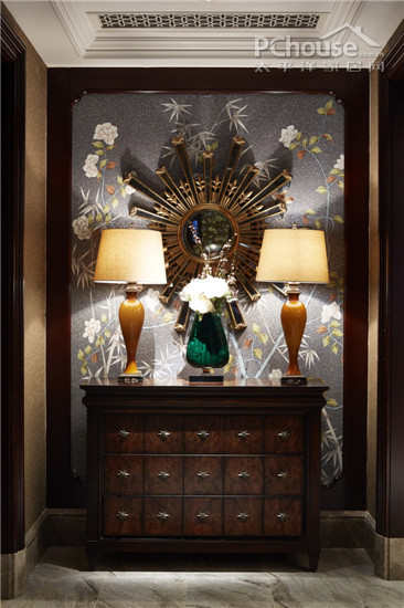 编辑点评:木质的吊顶天花,圆形的列柱,将空间打造出一种中国老建筑的味道。地面上点缀着中式纹样,颜色清新的装饰画装点着墙面,青花的花器之中插上春天气息浓浓的黄连翘,将这一空间打造的既有厚重的中式风情,又有现代的宜居感受。