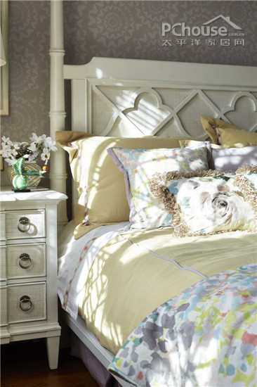 编辑点评:这是一个充满春天气息的空间,仿佛走进了“黄四娘家”,彩蝶处处,花满枝头。象牙白色的床带有春天的气息,床品春花烂漫,满室的蝴蝶好像要随着这春光翩翩起舞。