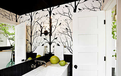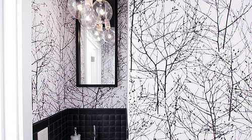 小编点评:这类暗色调的壁纸适合用于光线较好的房间,搭配上其对比色——白色洁具跟瓷砖,立刻展现出充满明亮卫浴空间。黑底上的白色花纹,精致复古,不管是色彩还是纹理上都十分考究。
