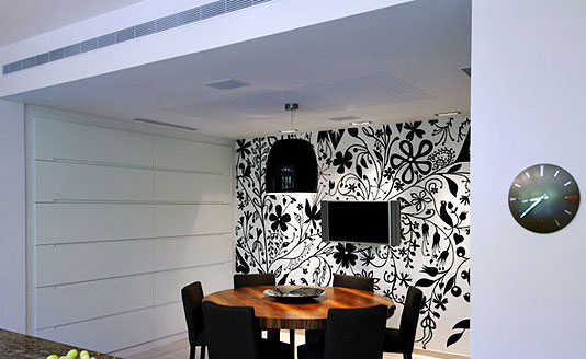 暗调的壁纸照样能呈现光线明亮的居室氛围,黑白色的壁纸具有画龙点睛的作用,它能让任何设计风格的房间变得时尚而典雅。当然,与家具间的配合也需反复推敲,因为不同的搭配会呈现出黑白色壁纸戏剧化般的视觉效果。