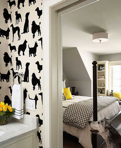 小编点评:黄色跟黑色总是会产生惊喜的搭配色,明媚的黄搭配深调的黑,强烈对比色令人印象深刻。屋主是个爱狗狗的人,墙面壁纸也选用了好多狗狗的黑白壁纸,狗的形态各异十分有趣。点亮空间不需要太多,一点点明媚的暖黄色就刚刚好。