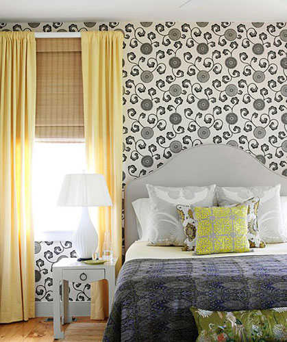 小编点评:偏向古典风格的壁纸体现出女性的温柔唯美,大多色调较浅的黑色花朵开满整个床头背景墙,细致复古。搭配原木色实木地板跟黄色软装配饰,空间活泼明艳。