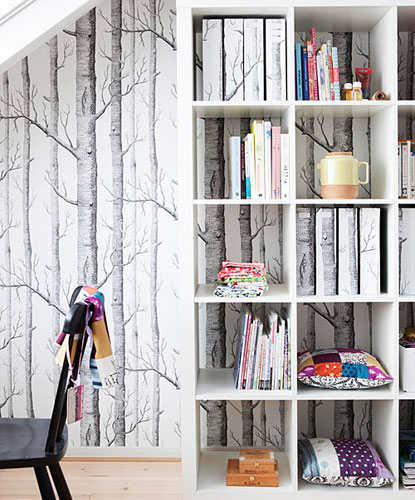 小编点评:在白色的基底上描画树木图案,与浅淡的墙面和木质地板形成强烈对比,壁纸的局部装点让墙面散发出悠扬的韵味,给人留下深刻的印象。
