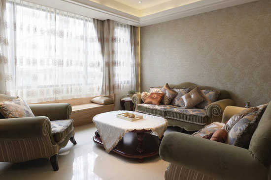 客厅的飘窗用座柜来体现,可以满足招待客人的需要。同时还增加了收纳的空间,让整个客厅看上去更加完整。也不会因为飘窗的存在,导致整个客厅出现不协调的感觉。