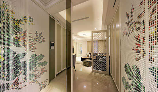 设计师演绎极致品味,揉合优美新古典与现代时尚的语汇,为这对年轻夫妻构筑幸福的居家生活。推开玄关门扉,流露出细腻精致的气韵,茶镜切割立面映衬着黑金峰与波斯灰交错的地坪,半穿透的夹纱玻璃作为端景屏风,引进自然光线也考量开门的风水。