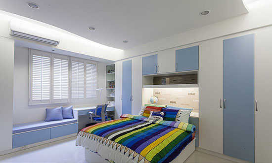 高高的床铺仿佛不断在散发出:躺下来吧,来躺一躺的执念!特别又是这类小卧室里,大大的床铺有着绝对的吸引力。白色的运用让小空间在视觉上得以膨胀,不会觉得压抑憋闷。