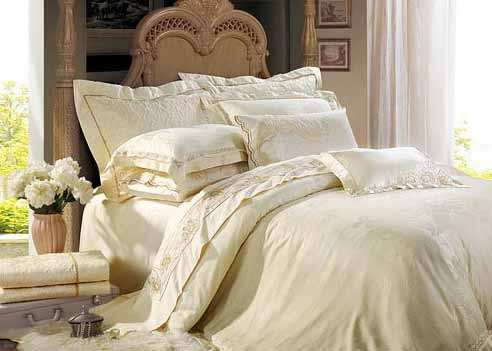 比白色更具温暖感的象牙色床品,圣洁祥和的气质也是西式婚房的不错选择,丝缎的质地,温润而贴肤,充满柔和而含蓄的华美光泽,金丝绣线,绣织出雅致的花纹,高贵而不张扬,体现精心精致的品位生活。