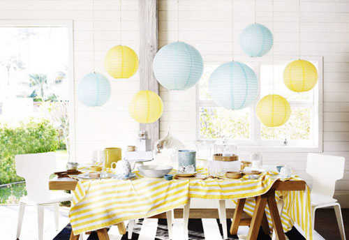野炊一样的餐厅布置,特别是纸糊的吊灯特别有个性,下方的黑白条纹地毯也是给淡色系的餐厅添加了一抹重色调。