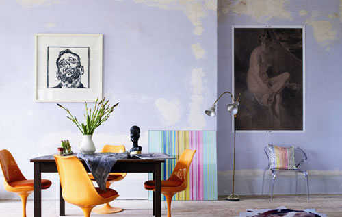 紫色的墙面让整个餐厅都带上了点点浪漫的感觉,橘黄色的用餐椅是空间中的色彩调剂,增加了空间的亮色感。