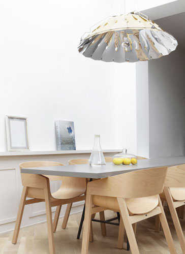 很有特色的吊灯,下方的餐桌椅有着圆润的外观以及流畅的线条感。原木色和周围的墙壁以及地板色彩一致。