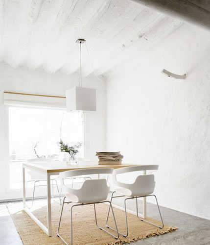 纯白空间,墙面就采用了凹凸不平的设计方案,后方的玻璃墙让阳关可以直接到到室内,地上的草席和整个餐厅的气质相符合。