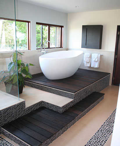 小编点评:不规则形状的地台重叠在一起,将浴缸抬到了一个很高的位置,真好对准了窗户。这样的设计利用在浴室中非常好,能很好的将干湿区分开,避免在洗澡时水溅出将其他地方弄湿。