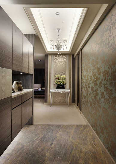 编辑点评:玄关地面材质使用白金琉璃石材,灰色混合着橙色的温暖层次,一路延伸到端景的屏风墙。