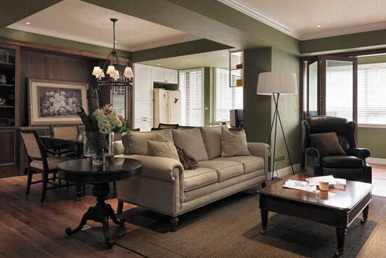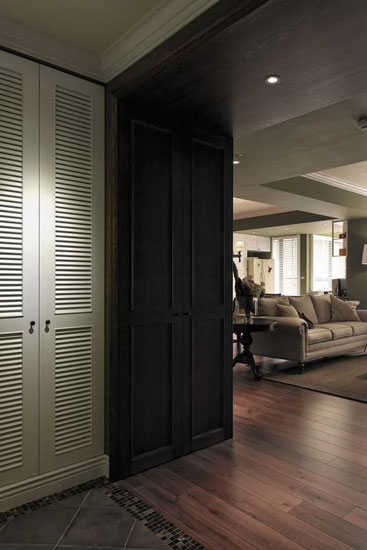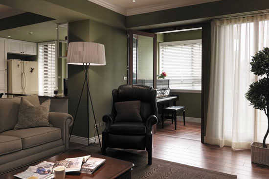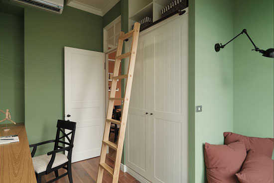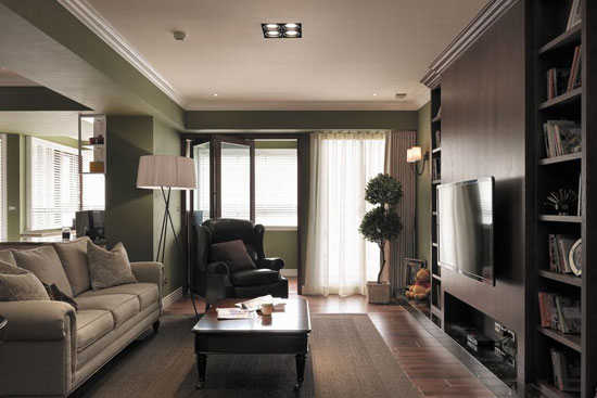 小编点评:设计师在空间的立面与梁柱,使用了灰绿色的ICI油漆,围塑整体的沉稳氛围,并于立面设计隐藏门,巧妙地增加收纳机能。