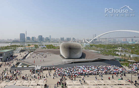 在展馆周围的空地上,还建有形同包装纸的遮阳处,观众能够在折起部分下乘凉。