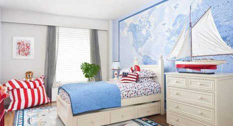 编辑点评:把世界地图搬上背景墙,让孩子在大海般的蓝颜色里构建自己的梦想。床头柜上摆设的帆船模型也很好地装饰了这一房间的主题。