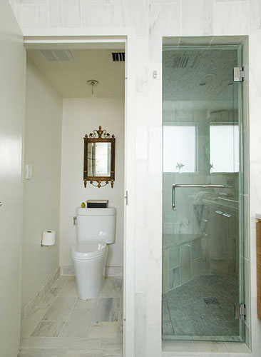 卫浴间被划分为两个区域,半开放式的隔断便是分界线。隔断采用了适当的加减设计:浴缸与卫浴柜间的墙体相对作高到空间间二分之一的地方,将较潮湿的浴缸隔开的同时,适当照顾隐蔽性;另一半则为玻璃门的设计。整个隔断留存得当,既起到阻隔作用又保证了卫浴间的宽敞观感。