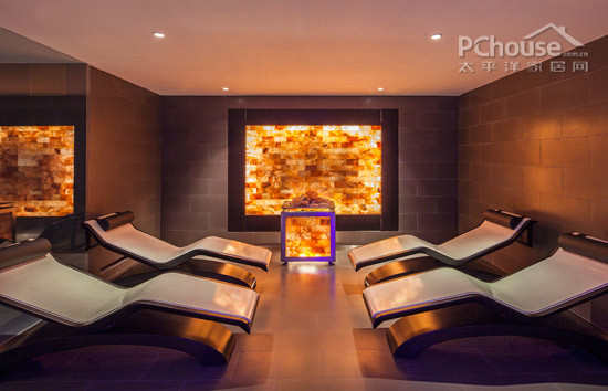编辑点评:水疗盐蒸房的躺椅设计十分现代化,为宾客量身订造的长度与高低配合,给人们宾至如归、见微知著的服务,专业提供最有效的疗程。盐蒸房的墙壁与地面均以灰色系砌砖铺设而成,低调之中透露着典雅。以清水打磨,使之自然平静的大理石灯饰装饰背景墙,在盐蒸房里发出暗黄灯光,打破灰色视线,又添一分酒店现代生活的气息。