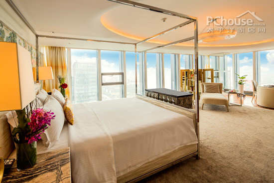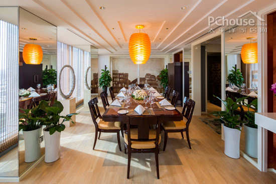 编辑点评:在干净明丽的立面镜子隔墙以及一眼纵观南京城市景象的落地窗的怀抱中,如此高贵典雅的首相套房用餐区在这巧妙的搭配中倍显开阔,更添舒适迷人的用餐风情。那一抹橙黄色亮丽的古典灯笼造型灯,是首相套房用餐区的点睛之笔,着眼于本土历史元素,突破奢华设计上的统一样式,构筑出符合现代追求而源于历史文化的审美意识。