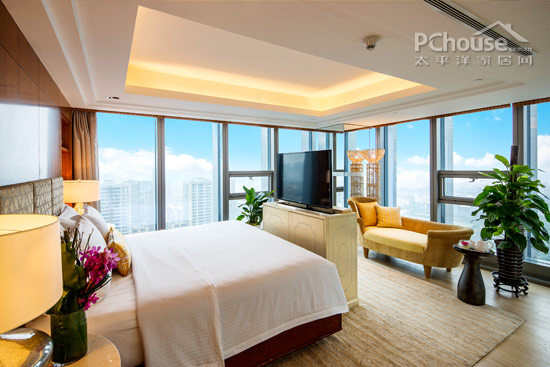 编辑点评:放眼看去首相套房卧室,住宿空间大,家具布置豪华而饱满,超大双人床、高端液晶电视以及低调质朴的棉质沙发成一线排列,位居卧室中央,各种摆设均成线性对比。卧室配以一应俱全的先进设施,为宾客呈现前所未有的住宿体验。简洁明了的白色天花床单、清新自然的淡蓝天空、绿意盎然的植物装饰,色彩强烈碰撞,成为室内悄然迸发的温馨火花。