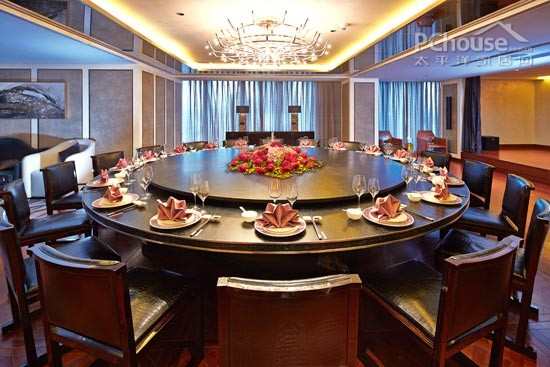 编辑点评:以南京帝王风格建筑为灵感,九九源中餐厅为宾客诠释纯正中华美食精粹,一场饕餮盛宴就在这整洁尊贵的用餐区上演。深色系桌椅与大气的灯饰营造一种成熟稳重的气息,富有现代感的背墙装饰、挂画,以及简单的落地窗帘共同构建富有现代感的空间基调。以色彩感浓厚的玫瑰花点缀中央,造型独特的餐桌手巾、高贵的酒杯等餐具就像大树般开枝散叶,围绕大圆桌向四周绽放,恒久诠释帝王风格。