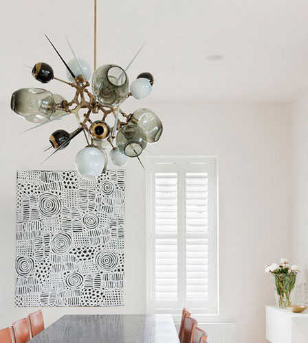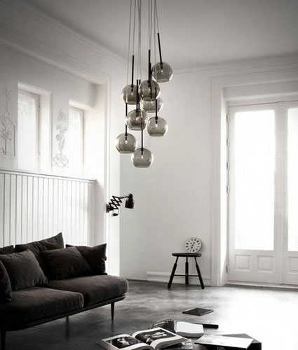 垂坠式的吊灯,以多个数量齐聚来打造气势,贴地式的直接照明,恍惚是那个睁着大眼睛,直愣愣瞅着你看傻姑娘,灵活性有限,但是装饰性极佳。高低错落的单头吊灯,白天可投射阳光成为空间中亮晶晶的焦点,夜晚呈现出群星闪耀也颇为壮观。