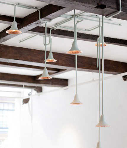 形体取材于牵牛花,枝蔓蜿蜒,花朵小而美,数量且巨,将这个自然的形态特征做了硬质化的处理,便是这一盏攀爬的屋顶上的牵牛吊灯了,高高低低的多头吊灯,浮生若梦的光影呈现。