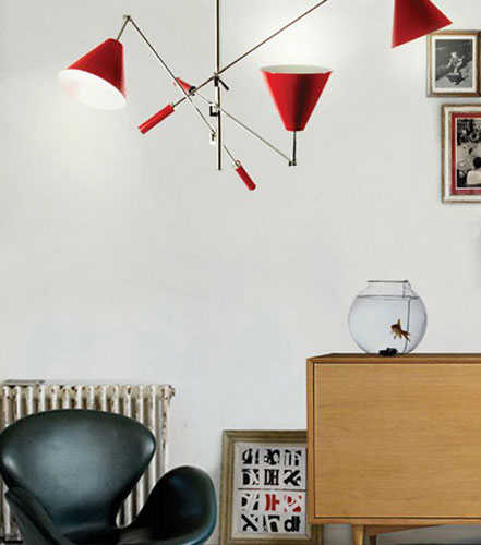 极细的金色灯管,极骚包的红色灯罩,这个女性化的配色有没有让你想起女孩子的红底细跟高跟鞋呢? 线条明朗,曲折利落。从功能上说,三个灯具可移动照明,三倍灵活,高效照明。