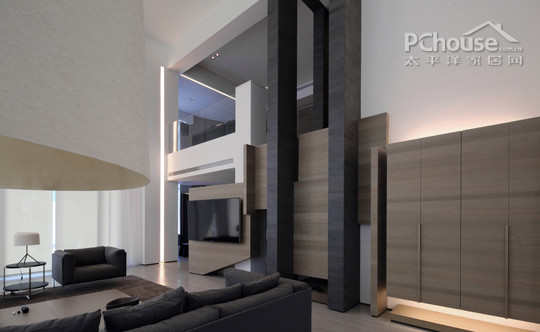 编辑点评:楼梯间和二楼平台是欣赏人与空间互动所产生美感的绝佳位置。一处短小的隐蔽式楼梯延伸出空间的另一个纬度,加上透明玻璃进行隔离,空间质感顿时喷薄而出。