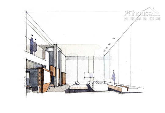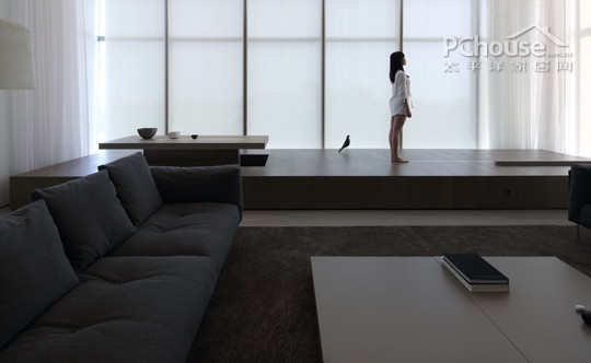 编辑点评:客厅窗前的木质地台在整个空间中占有一定比重,为此,在大挑高的景观窗形成的背景之下,该区域在实际使用中成为展现生活趣味的舞台。