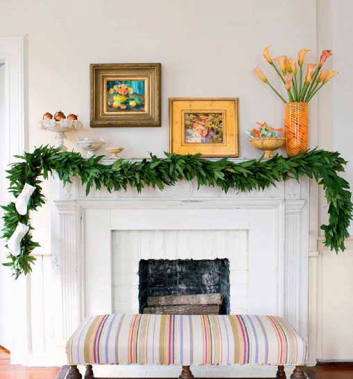 未经装饰的青翠花环穿过壁炉上方,与白色的墙体形成鲜明的对比。大小不一的托盘与花瓶有序地排列在壁炉上方,洋溢出的是橙色的温暖与明媚。