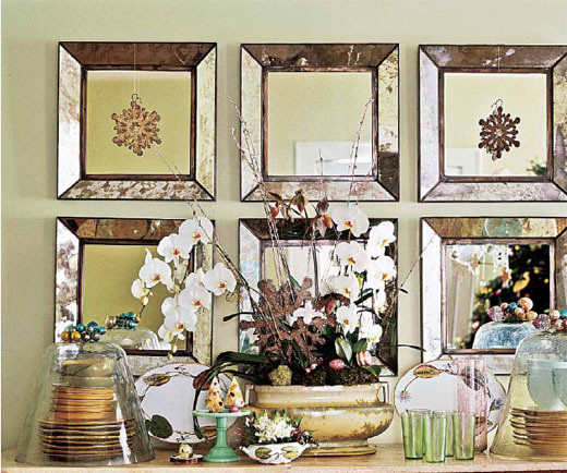 餐桌是吸引眼球的中心。餐桌中央的摆设就想一件艺术品,调节着整个节日的色彩。一面不带边框的大镜子被放置在餐桌中心作为装饰得基础,在玻璃大罐或大花瓶中装满水果或装些饰物,摆放于镜面中央,在罐子周围随意地摆上蜡烛,洒些绿枝或小装饰物,整个餐桌因此充满浓浓绿意。