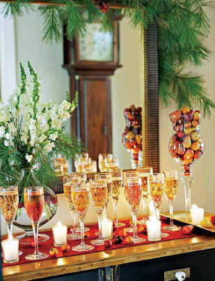 单一物品的整齐排列也可以营造一种气氛,是一种特别的装饰手法。用一整桌闪耀着光泽的酒杯就能增添节日的欢乐气氛。餐柜上方,绿色嫩枝装饰的镜面顶部,让镜子成为节日的焦点。在玻璃花瓶中,插上玫瑰,并在其中增加些松树或冷杉的枝条,最后再洒些酸果蔓,就立即把普通的花束变成了节日的花束。