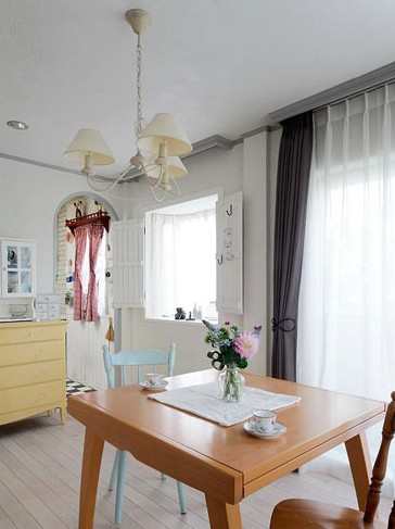 装饰Tips:柠檬黄的墙壁,给人青春活力的感觉,彰显年轻人热情奔放的特点。而深木色的餐桌和椅子又展现出日本人固有的宁静和淡雅,古朴气息浓郁。深木色的餐具,圆润的线条,搭配木色方方正正的餐桌,整体线条流畅。手工编织的竹制小筐用来装水果等物品,增添了整体的自然气息。而碎花图案的窗帘,更使自然气息弥漫整个装饰空间。
