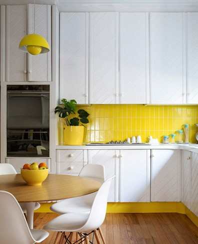 装饰Tips:鲜黄色和白色为主的餐厅,用黄色增加人积极的情绪和食欲之外,柠檬般的清爽让空间更显时尚。柠檬黄墙壁、吊灯和白色壁柜、椅子搭配,强相呼应,色彩跳跃,给人活泼轻松的感觉。更好地打造了一个整齐、洁净的开放式厨房和就餐区。