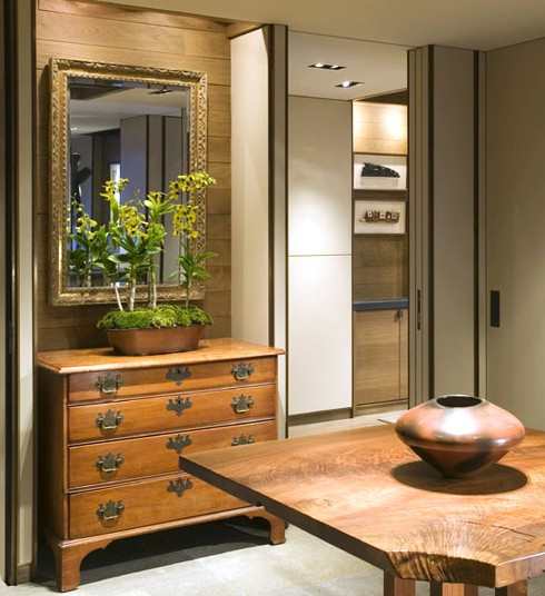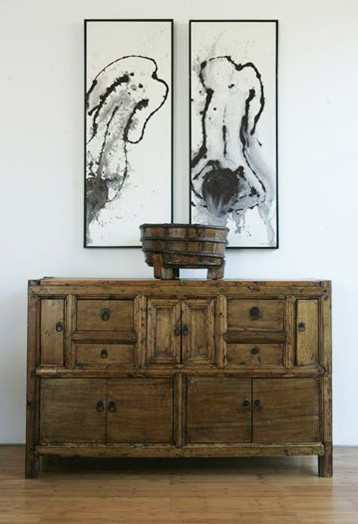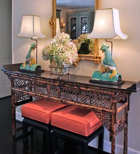 应用元素:玄关柜+水墨画。中式玄关柜风格古朴却不失时尚感,自然的原木色,斑驳的木材肌理,铜质环形扣拉手,带着时间的沉淀。它的收纳功能同样不可忽视,不同大小的收纳空间可以满足不同需要的收纳要求。另外,木质的鼎状装饰,以及装点墙面的中国传统水墨画平添不少情趣。