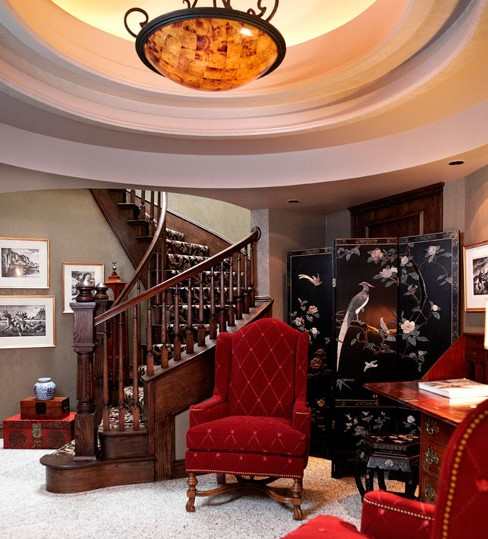 应用元素:手绘花鸟图案漆面屏风。许多别墅或大户型都会附带一个大面积的入门玄关,此处的玄关也可兼做休闲区,摆放上简约的红木桌子,搭配格纹图案的红色单人沙发,楼梯另一侧装饰以蓝白色中国风格的陶瓷花瓶。这是一个混搭风格的玄关,手绘的花鸟图案漆面屏风是这个玄关设计的主角,丰富整个玄关空间的第一眼视觉。