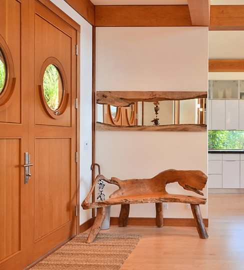 应用元素:不规则木凳。玄关设计采用简约风格,充分利用木材的不规则造型。玄关没有多余的摆件,只有一张创意十足的不规则木凳子,依稀还能看出传统中式板凳的影子。一面长型的玄关镜同样利用不规则造型的木材镶边,玄关风格随意而清爽。
