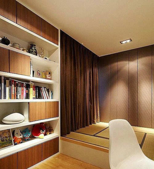 小编的话:书房内地台的设计为这间书房提升了整体舒适度,大面书架的设计可以帮助房主收纳许多书籍,整个书房中运用暖色的照明来烘托出温馨的氛围,咖啡色系的墙面与木色地板都使这一空间中透出一种沉稳。